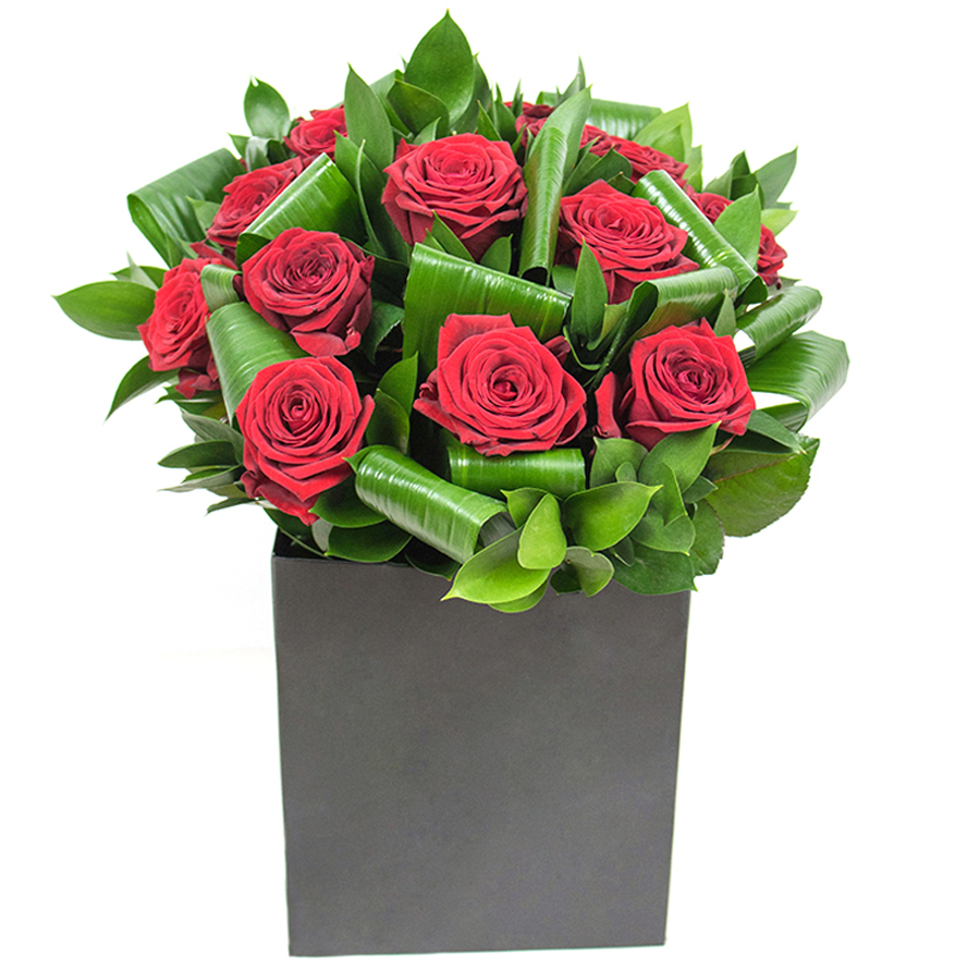 Unveil the magic of our sophisticated floral masterpiece, crafted with passion and attention to every detail. Our bouquet features stunning red roses accented with aspidistra leaves and subtle ruscus, creating a visually striking display. Each bloom is meticulously hand-selected to ensure exceptional quality and lasting vibrancy.