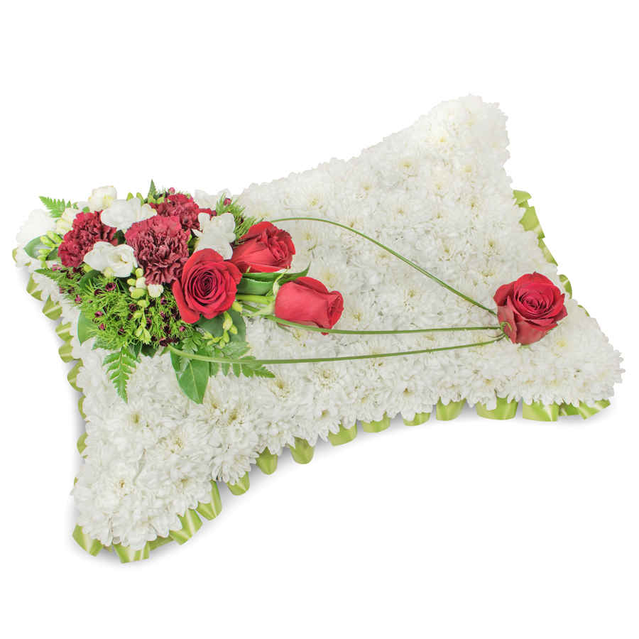 Express your deepest sympathies with our heartfelt condolence bouquet, thoughtfully designed to offer comfort and elegance. This unique arrangement features a beautiful mix of white chrysanthemums, red roses, white freesias, dark red carnations, dianthus, and bear grass, each hand-selected for maximum freshness and beauty.
